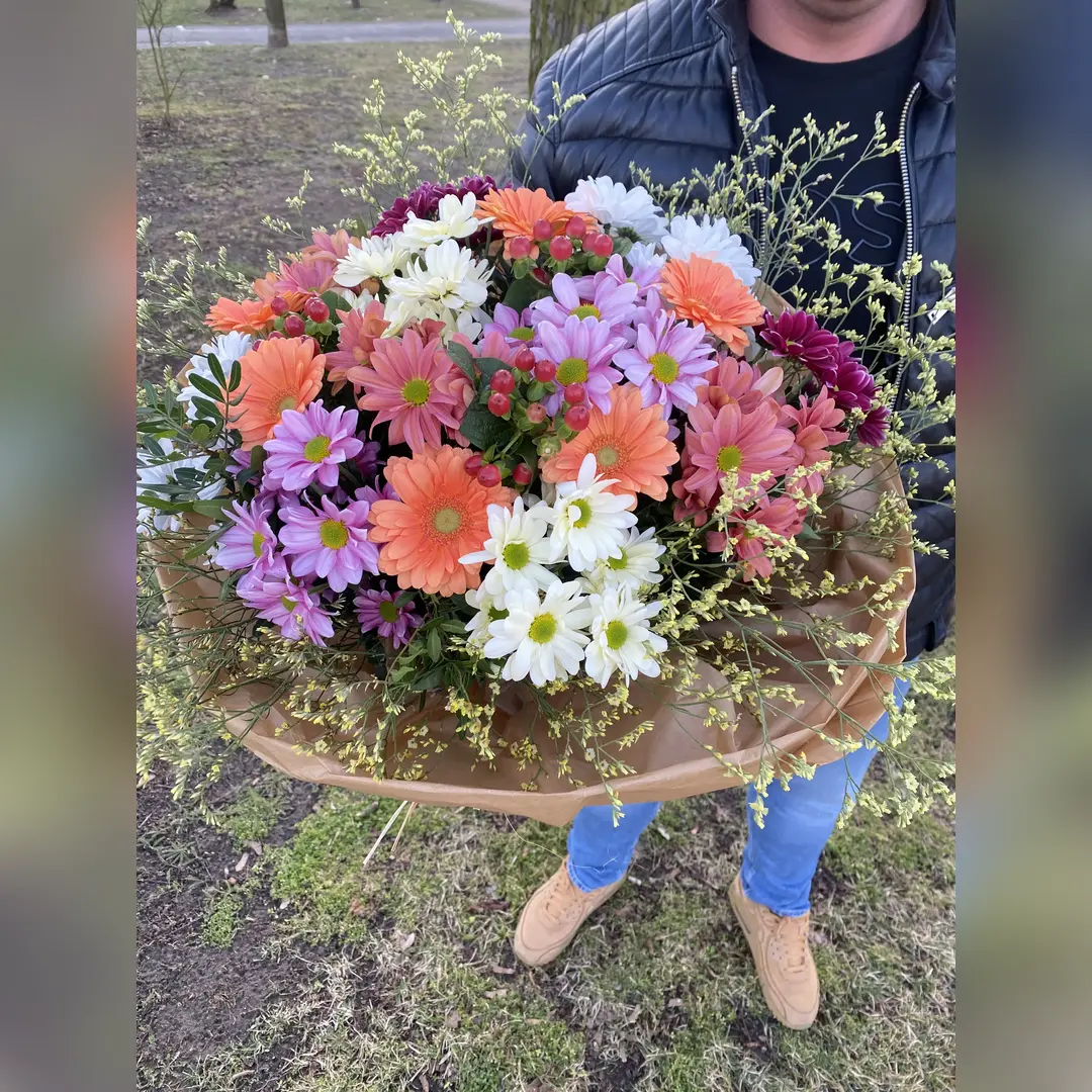 Duży, okrągły bukiet naturalny i piękny z pastelowych kwiatów: gerbery, kolorowej margaretki przybrany wokół żółtym limonium. Otaczająca bukiet kryza z brązowego, woskowanego papieru podkreśla urok kwiatów jakby dopiero zerwanych w letnim ogrodzie.