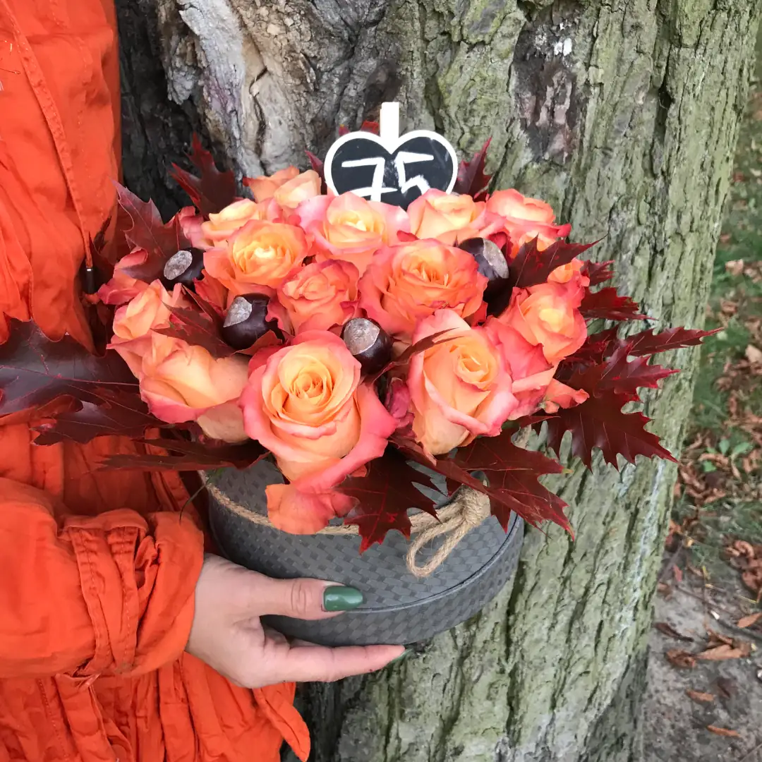 Jesienna kompozycja z pomarańczowych róż i bordowych liści w szarym, satynowym pojemniku ze sznurkiem. Ciepły akcent na chłodne dni.